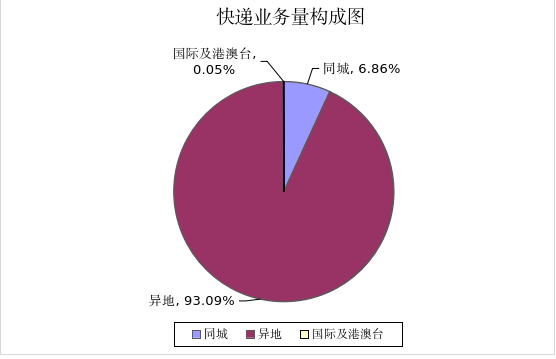 2024年,同城、异地、国际及港澳台快递业务量分别占全省快递业务量的6.86%、93.09%和0.05%;与去年同期相比,同城快递业务量的比重下降0.68个百分点,异地快递业务量的比重上升0.66个百分点,国际及港澳台业务量的比重上升0.03个百分点。